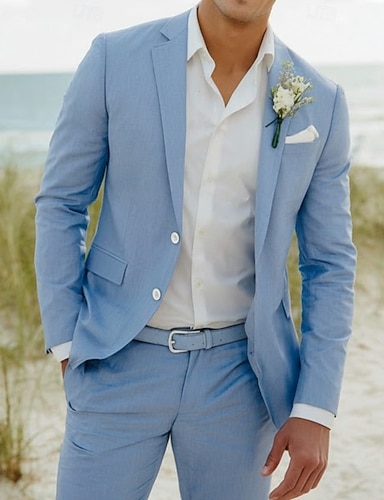 De los hombres Smoking Trajes de Lino boda en la playa Casual Azul cielo Salvia Primavera, Otoño, Invierno, Verano Traje Solapa de Pico Moda Diario Color sólido Estándar Juego de 2 piezas Recto 2