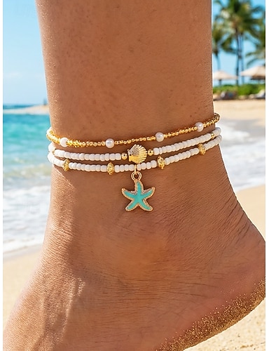 Conjunto de tobillera con colgante de estrella de mar de aleación estilo bohemio para mujer, 3 piezas de joyería para vacaciones en la playa, uso diario informal, ligero, ajustable, accesorio de moda para el verano