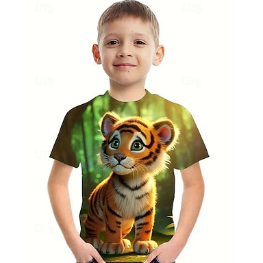 Chico 3D Animal Tigre Camiseta Manga Corta Verano Primavera Moda Básico Niños 4-12 años Cuello Barco Exterior Casual Diario Ajuste regular