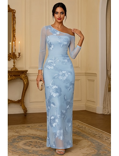 Funda Columna Hasta el Suelo Bordado con cuentas Vestido formal Vestido de madre de la novia Vestidos de noche Vestimenta formal Elegante Vintage Manga Larga Un Hombro Boda Formal Encaje con Apliques