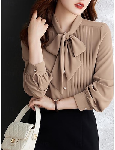 Mujer Blusa Acordonado Color sólido Elegante Básico Casual Manga Larga Escote en Pico Tops regulares Diario Blanco Fucsia Verano Primavera Otoño