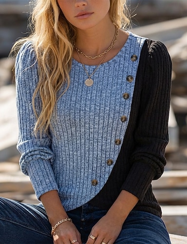 Mujer Tops tejidos de canalé Blusa Con Texturas Retazos Bloque de Color Botones Bloque de color Vintage Elegante Casual Manga Larga Cuello Barco Tops regulares Diario Azul Piscina Verano Primavera
