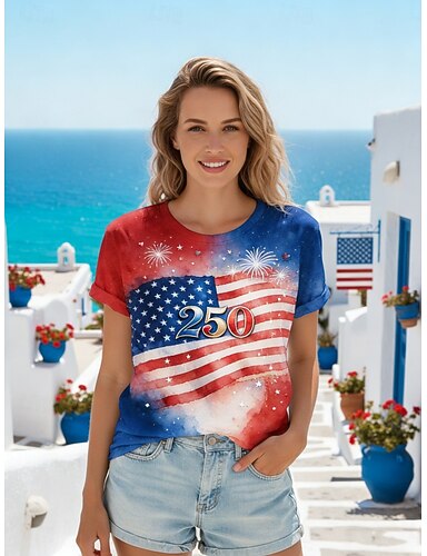 día de la independencia americana Mujer Camiseta Camiseta superior Estampado Graphic Bandera Elegante Clásico Casual Manga Corta Cuello Barco Tops regulares Diario Noche Azul Piscina Rojo Azul Real