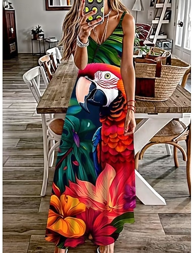 Mujer Vestido maxi Vestido de verano Vestido de una línea Vestido lencero Vacaciones Casual Boho Playa Ajuste regular Graphic Hoja Animal Sin Mangas Escote en Pico Naranja Verano Primavera