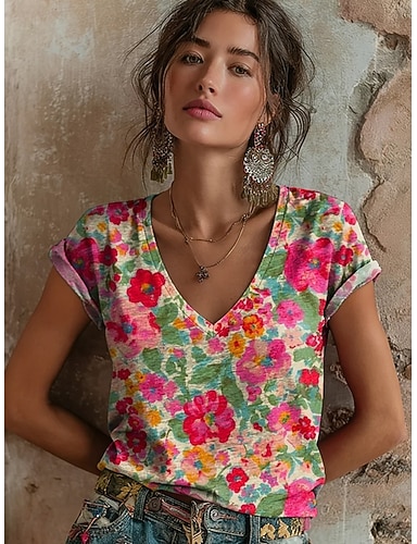 Mujer camisa boho Camiseta Estampado Floral Graphic Bohemia Vintage Casual Manga Corta Escote en Pico Tops largos Diario Rosa Azul cielo Caqui Verano Primavera