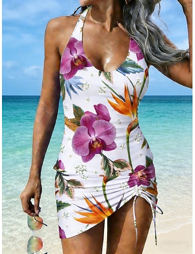 Mujer Bañadores Tankini 2 piezas Falda Traje de baño Correa Cabestro Elegante Vacaciones Floral Camiseta con cuello redondo Sin Mangas Trajes de baño