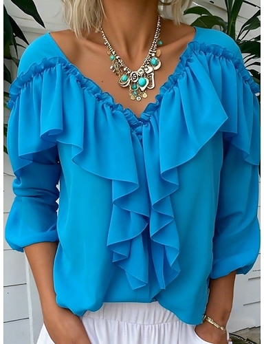 Mujer Camisa de manga corta Camisa casual Blusa Volante Color sólido Moda Casual Manga Larga Escote en Pico Tops regulares Diario Playa Festivos Azul Piscina Negro Blanco Amarillo Rosa Verano
