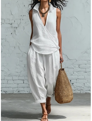 Mujer Conjuntos de pantalones Lino de algodón sintético Sin Mangas Escote en Pico Color sólido Moda Ropa de calle Casual Diario Exterior Azul Piscina Blanco Marrón Verano Holgado