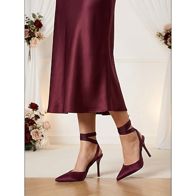 Zapatos de tacón de satén burdeos con correa al tobillo para mujer: elegantes zapatos de tacón de aguja con punta puntiaguda para invitadas a bodas en la ciudad.