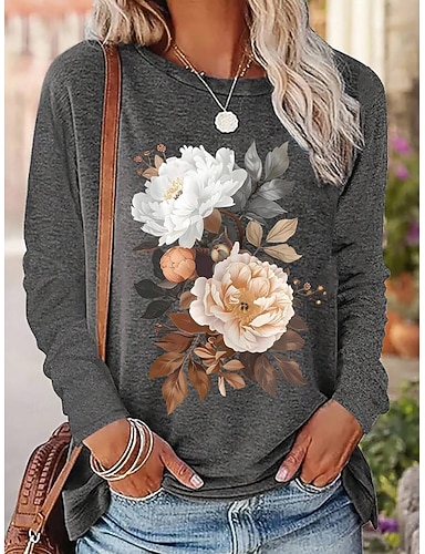 Mujer Camiseta Estampado Floral Graphic Plantas Moda Elegante Clásico Manga Larga Cuello Barco Escote Redondo Tops regulares Diario Fin de semana Gris Verano Primavera Otoño