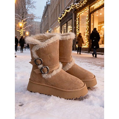 Botas de invierno marrones para mujer con forro de piel sintética: detalle de hebilla, calidez acogedora y suela de plataforma para un look casual al aire libre, días de nieve y moda invernal.