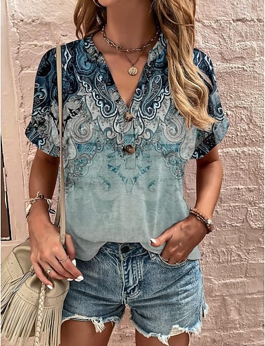Mujer Camiseta Camiseta superior Botones Estampado Ombre Floral Graphic Bohemia Vintage Manga Corta Escote en Pico Tops largos Diario Noche Fin de semana Azul Piscina Morado Verde Trébol Verano
