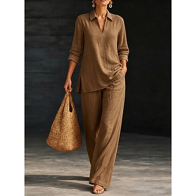 Mujer Camisa Conjuntos inspirados en el lino Conjuntos de dos piezas Pantalones de lino Pantalones Manga Larga Cuello Camisero Color sólido Moda Ropa de calle Ropa Cotidiana Cita Verde Ejército Azul