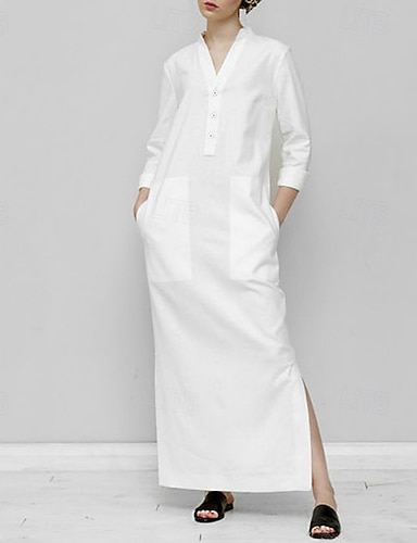 Mujer vestido largo vestido largo Lino de algodón sintético Vestido de cambio Vestido informal Elegante Moda Moderno Diario Vacaciones Noche Holgado Plano Manga Larga Escote en Pico Negro Blanco