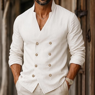 Hombre Camisa Camisa de lino Camisa con cuello mao Camisa de verano Ropa de playa Abotonar la camisa Plano Formal Vacaciones Negro Blanco Azul Piscina Manga Larga Collar mandarín Verano Primavera Ropa