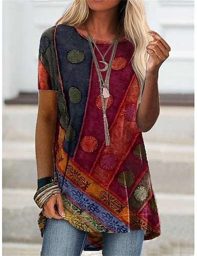 Mujer Camiseta Estampado Graphic Geométrico Vintage Elegante Casual Manga Corta Cuello Barco Escote Redondo Tops regulares Casual Diario Azul Piscina Rosa Morado Naranja Verano Primavera