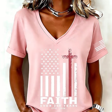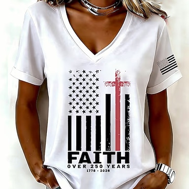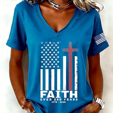 día de la independencia americana Mujer Camiseta Estampado Graphic Bandera estadounidense Vintage Elegante Clásico Manga Corta Escote en Pico Tops regulares Diario Fin de semana Blanco Azul claro