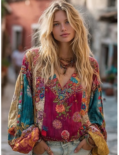 Blusa Boho de Mujer Como Lino Transpirable Ligera Floral Elegante Bohemia Vintage Manga Larga Cuello en V Tops Regulares Diario Vacaciones Patchwork Botones Impresión Rojo Púrpura Claro Verano