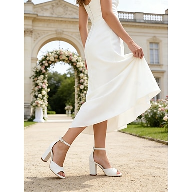 Tacones blancos de dama de honor para mujer: sandalias de boda con punta abierta y tacón de bloque con tira en el tobillo, elegantes zapatos de fiesta nupcial.