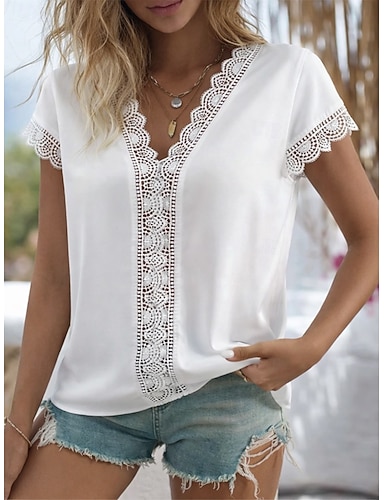 Mujer Camiseta Camiseta de encaje Camiseta superior Encaje Retazos Plano Moda Elegante Clásico Manga Corta Escote en Pico Tops regulares Diario Noche Fin de semana Blanco Verano Primavera
