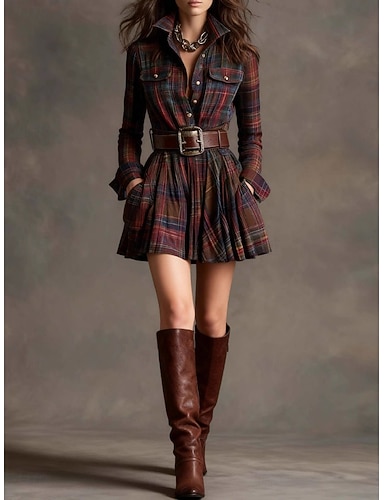 Mujer Mini vestido Vestido de cuadros Vestido de Camisa Vestido bohemio Vintage Moda Exterior Vacaciones Festivos Ajuste regular Plaid Manga Larga Cuello Camisero Blanco Verde Oscuro Marrón Azul