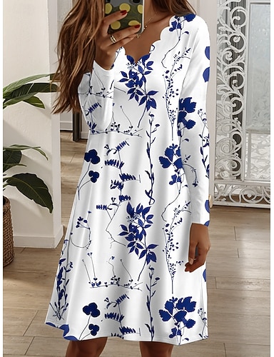 Mujer Mini vestido Vestido de cambio Vestido de una línea Casual Diario Ajuste regular Floral Graphic Manga Larga Escote en Pico Amarillo Rojo Azul Piscina Morado Primavera Otoño Invierno