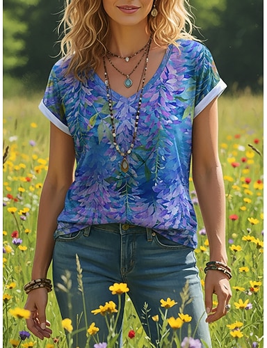 Mujer Camiseta Estampado Ombre Floral Graphic Vintage Elegante Clásico Manga Corta Escote en Pico Tops regulares Diario Azul Piscina Amarillo Rosa Morado Verano Primavera