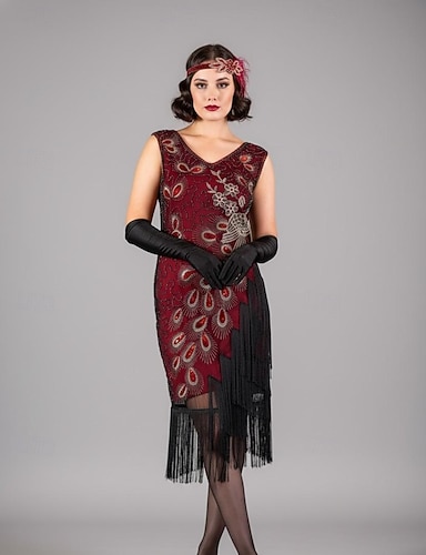 Conjunto Rugido 20s 1920s Hasta la Rodilla Vestido Flapper con accesorios Mangas cortas El gran Gatsby Chica de la aleta Lentejuelas Borlas Escote en Pico Disfraz Mujer Navidad Año Nuevo bar