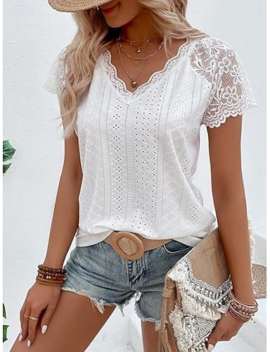 Tops de encaje elegante blanco para mujer blusa de ojales casual color sólido tops regulares manga corta cuello en V encaje ojales ajuste regular moda diaria blanco amarillo tops románticos petite