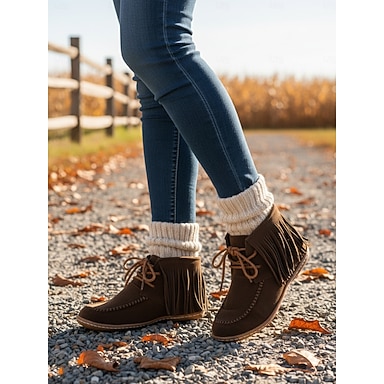 Botas mocasín de ante sintético con flecos para mujer: botines retro con cordones para otoño, aventuras al aire libre y estilo casual diario.