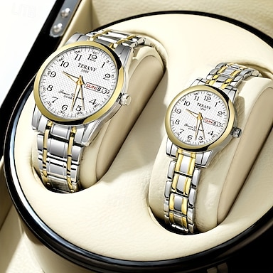Conjunto de relojes para parejas, relojes a juego para él y para ella, reloj de pulsera de cuarzo de acero inoxidable dorado bicolor con indicador de día y fecha, resistente al agua, regalo para