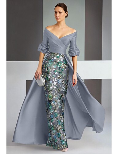 Corte A Funda Columna Hasta el Suelo Bordado con cuentas Vestido formal Vestido de madre de la novia Vestidos de noche Elegante Split High Manga 3/4 Hombros Caídos Boda Formal Satén con Estampado