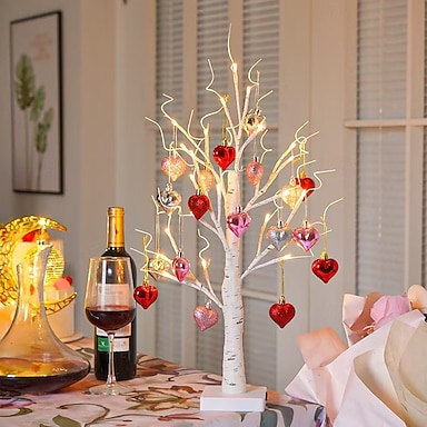 Decoración de San Valentín: árbol de abedul iluminado con adornos de corazón, lámpara romántica de abedul en forma de corazón, luces artificiales de mesa para decoración de interiores, iluminación