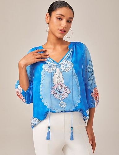 Mujer Camisa casual Geométrico Casual Obispo Azul Piscina corbata frontal Manga 3/4 Elegante Vacaciones Escote en Pico Verano Otoño Temporadas Cruzadas