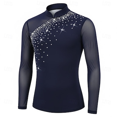 Top de patinaje artístico Hombre Chico Patinaje Sobre Hielo Tops Azul Marino Retazos Malla Licra Alta elasticidad Entrenamiento Competición Ropa de Patinaje Clásico Cristal / Strass Manga Larga