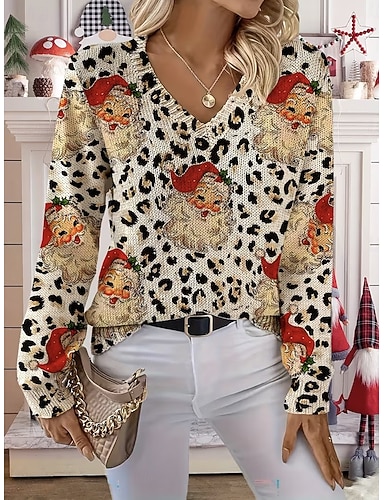 Mujer Pulóveres Pull-over Moda Ropa de calle Casual Graphic Leopardo Papá Noel Escote en Pico De Gran Tamaño De Punto Manga Larga Tops regulares Tejer Exterior Diario Caqui Primavera Otoño