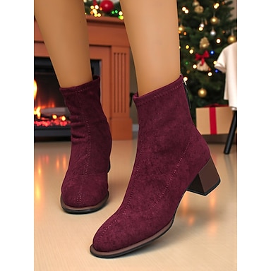 Botines de ante burdeos para mujer con tacón cuadrado: calzado de invierno retro chic para mujer, para looks diarios y semiformales.