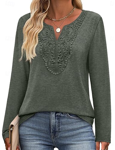 Mujer Blusa Encaje Retazos Color sólido Elegante Casual Manga Larga Escote en Pico Tops regulares Diario Albaricoque Verano Primavera Otoño