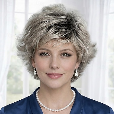 Peluca plateada corta y elegante para mujer: estilo pixie despeinado con volumen natural.