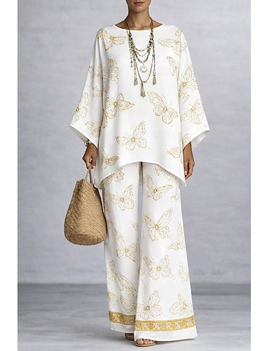 Mujer Conjuntos de pantalones Manga Larga Escote Redondo Graphic Mariposa Estampado Moda Ropa de calle Casual Diario Exterior Azul Piscina Blanco Rosa Verano Holgado