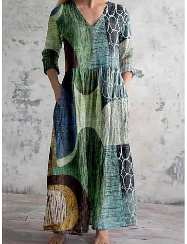 Mujer Vestido Midi Vestido de Camisa Vestido informal Vestido bohemio Moda Clásico Moderno Diario Exterior Vacaciones Ajuste regular Geométrico Manga Larga Escote en Pico Verde Trébol Verano