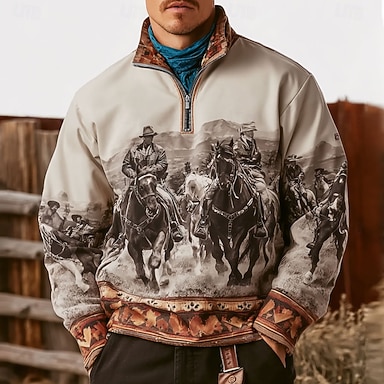 Hombre Tribal Cowboy Sudadera Étnico retro de la vendimia Manga Larga Escote Chino Exterior Trabajo Regalo Negro Marrón Verde Trébol Cremallera Otoño Invierno Diseñador S M L XL XXL XXXL