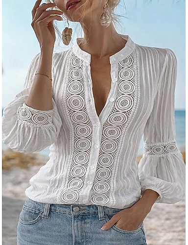 Mujer Blusa Encaje Botones Color sólido Elegante Casual Manga Larga Cuello Alto Tops regulares Diario Blanco Verano Primavera Otoño