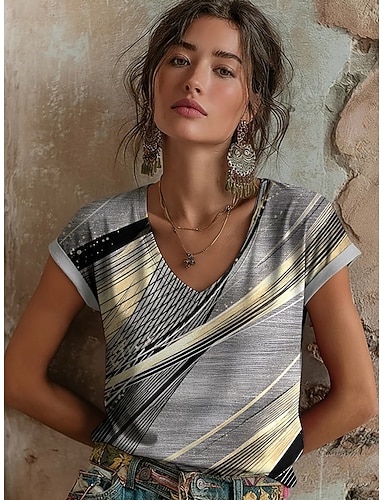Mujer Camiseta Estampado Graphic Geométrico Bohemia Vintage Casual Manga Corta Escote en Pico Tops regulares Diario Azul Marino Gris Claro Gris Verano Primavera