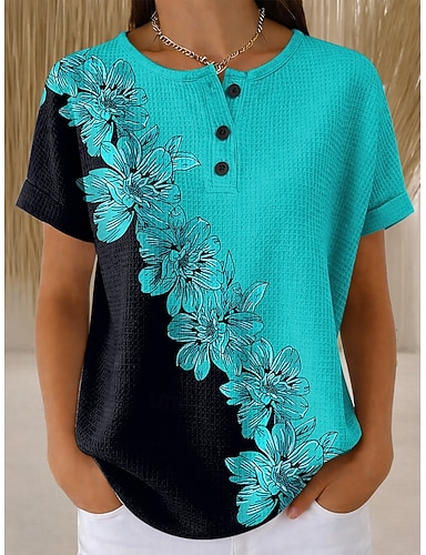 Mujer Camiseta Bloque de Color Estampado Floral Graphic Vintage Elegante Clásico Manga Corta Cuello Barco Tops regulares Diario Azul Piscina Rojo Morado Verde Trébol Verano Primavera