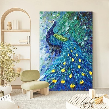 Pintura al óleo hecha a mano, lienzo, decoración artística de pared, animal, pavo real azul abstracto para decoración del hogar, pintura enrollada sin marco y sin estirar