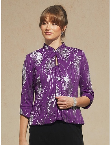 Mujer Blusa Tops elegantes Tops de noche Lentejuelas Pluma Elegante Manga 3/4 Collar mandarín Tops regulares Fiesta de Noche Ropa formal Traje de cóctel Color Berenjena Primavera Otoño Invierno