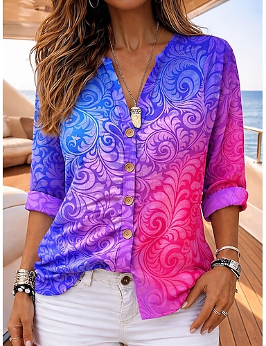 Mujer Camisa Sayo Tops de verano Botones Ombre Graphic Vacaciones Diario Manga Larga Escote en Pico Tops regulares Diario Festivos Noche Azul Piscina Morado Naranja Verde Trébol Verano Primavera