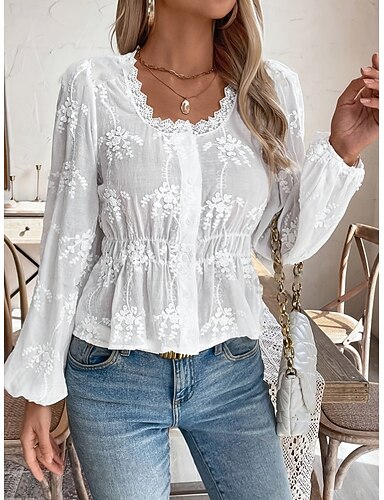 Mujer Camisa Blusa Tops de encaje Encaje Plano Elegante Clásico Moderno Manga Larga Escote en U Tops regulares Diario Festivos Noche Blanco Verano Primavera