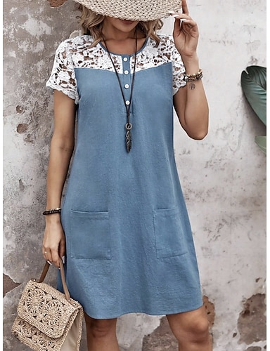 Mujer Vestido hasta la Rodilla Vestido de encaje Vestido informal Elegante Moda Moderno Exterior Vacaciones Noche Ajuste regular Holgado Plano Manga Corta Cuello Barco Negro Azul claro Verano